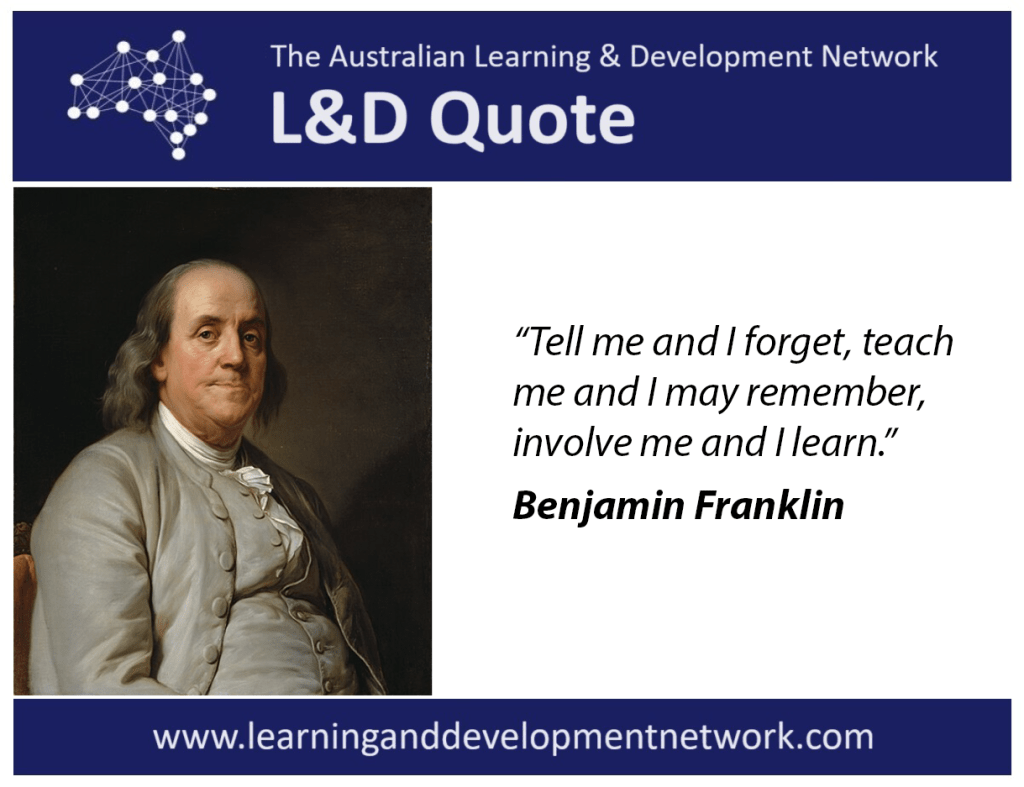 Here’s this week’s L&D quote, this one from Benjamin Franklin. We hope it resonates with our learning and development readers and, perhaps, offer some capability development inspiration and motivation to share with the workforce!